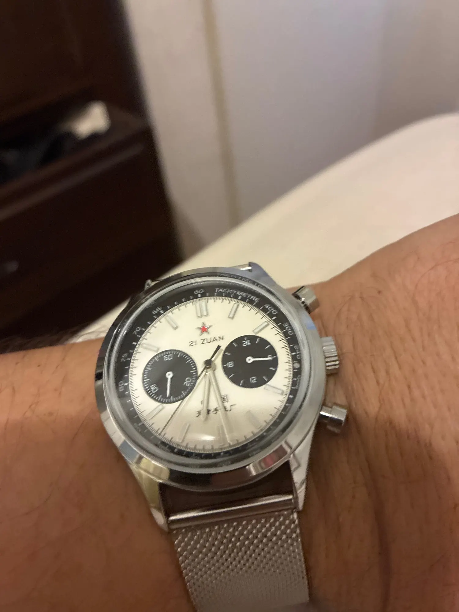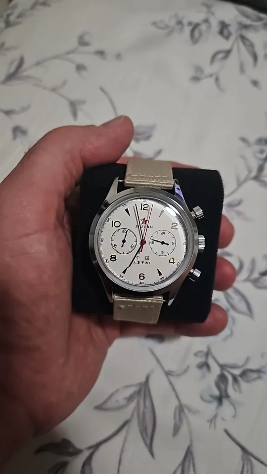 Classic 42mm dial with bold Arabic numerals, chronograph sub‑dials, and a clean layout reminiscent of mid‑century aviation watches. -