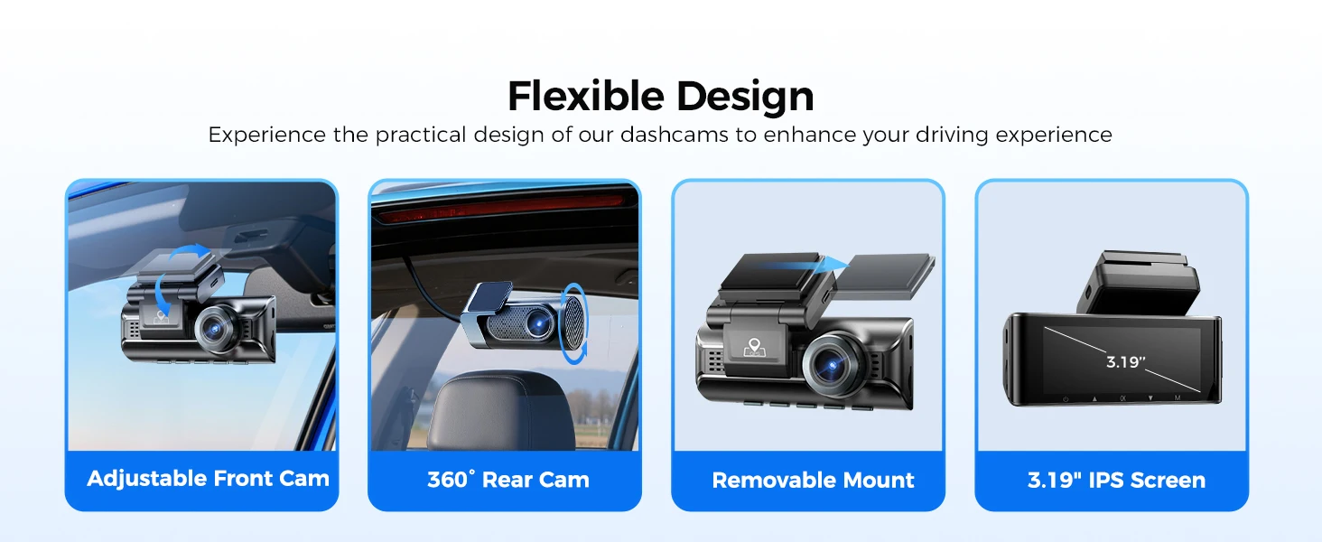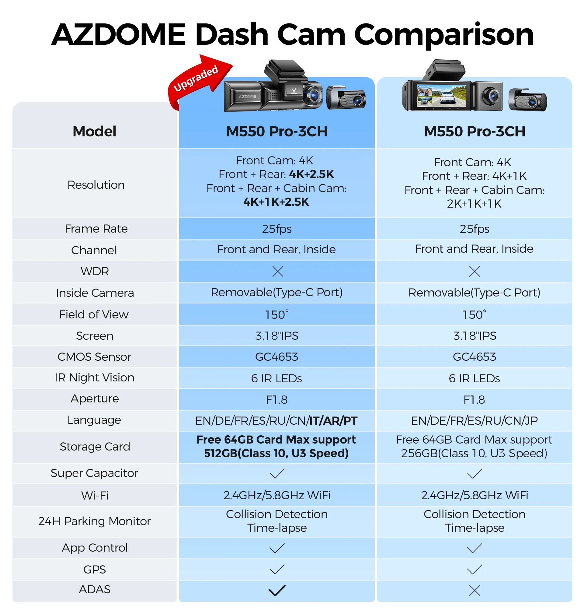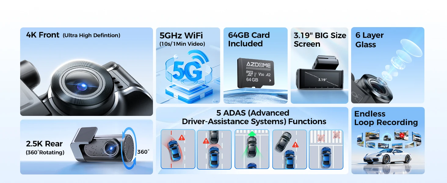 Achieve complete cabin and road coverage with the AZDOME M550 Pro 3-Channel Dash Cam. This advanced system records in 4K UHD (front), 2.5K (cabin/interior), and 1080p (rear), offering triple‑angle protection. Built‑in GPS, 5.8GHz Wi-Fi, a super capacitor for extreme temperatures, and optional 24‑hour parking monitoring make it a robust, feature‑rich choice for drivers who demand maximum visibility and reliability.