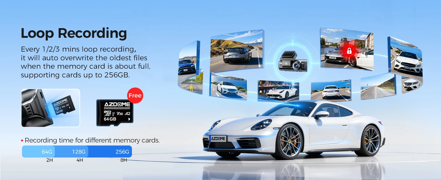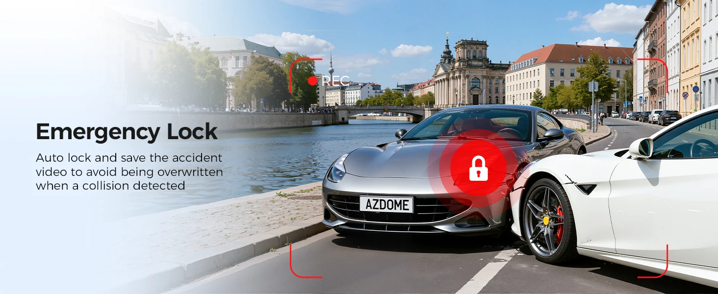 Optional hardwire kit enables continuous surveillance; G‑sensor auto‑locks footage upon collision or vibration. -