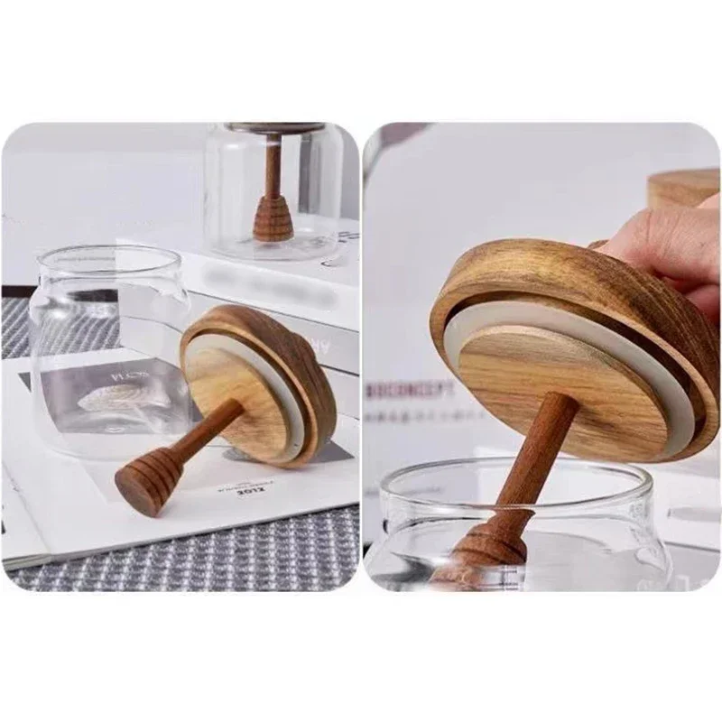 Transparent High Borosilicate Glass Honey Jar Sealed Tank with Wooden Lid Mixing Rod Storage Container
